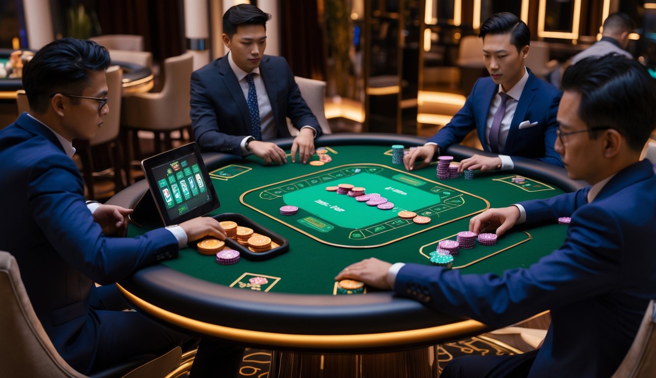 Meja poker interaktif dengan pemain yang fokus bermain di lingkungan kasino yang mewah.